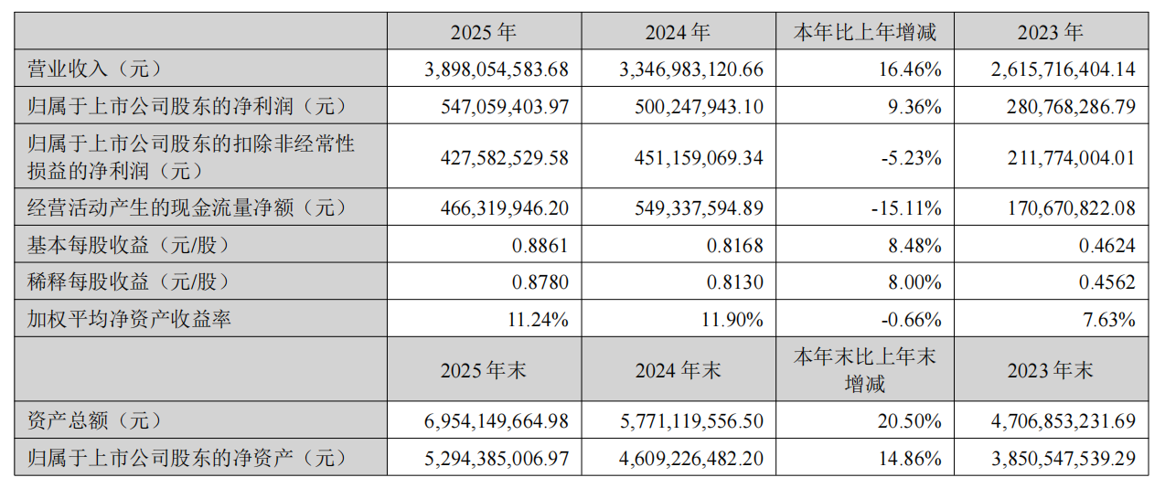 模拟芯片行业技术密集,圣邦股份近年来保持着业绩的稳健增长。2024年营收33.47亿元,同比增长27.96%,净利润5亿元,同比增长78.17%;2025年营收38.98亿元,同比增加16.46%;净利润5.34亿元,同比增加8.80%,其中,归属于母公司股东的净利润5.47元,同比增加9.36%,增速处于国内同行前列。