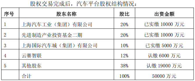 本次交易完成后,云赛智联将持有汽车平台12%股权(认缴出资6000万元),上汽集团持股比例调整为20%,先进制造产业基金持股20%,上海国际汽车城持股10%,其余38%由其他股东持有。