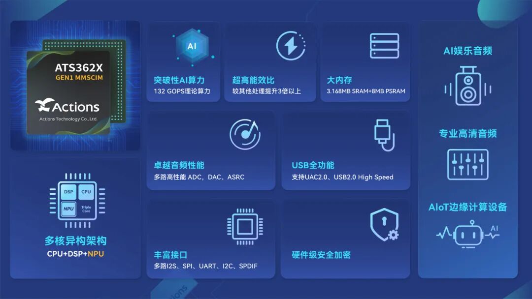 对于客户开发团队而言,ATS362X是一个极致平衡且高度集成的开发平台,采用CPU+DSP+NPU三核异构架构,基于存内计算实现AI加速引擎(NPU),提供了高达132 GOPS@500MHz的充沛算力,让复杂 AI 算法的部署不再受限于传统芯片的功耗瓶颈。