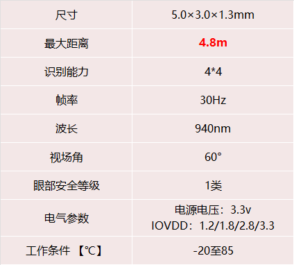 结合940nm VCSEL与光学/算法优化机制,在最大4.8m有效测距范围内,有效抑制串扰与环境光干扰,同时通过片上处理架构降低主控负担,实现更低功耗运行。