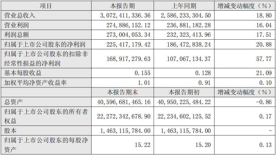 财务指标方面,报告期末公司总资产为405.97亿元,较期初微降0.86%;归属于上市公司股东的所有者权益为222.72亿元,较期初增长0.17%;归属于上市公司股东的每股净资产为15.22元。