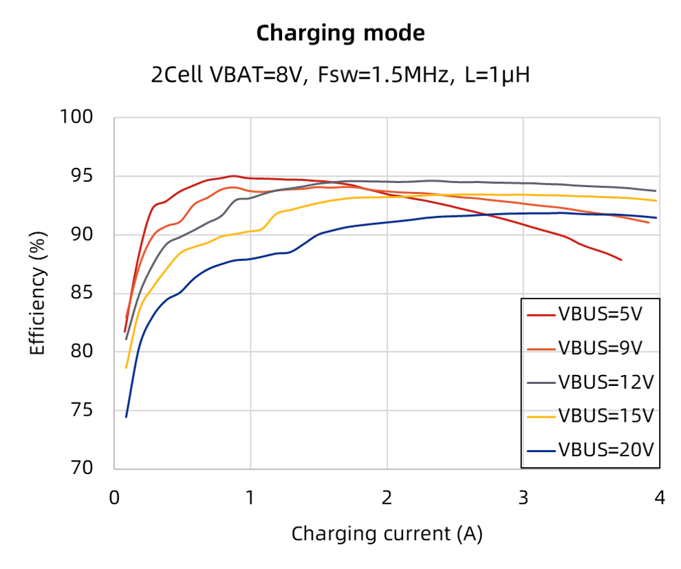 SC8984 集成的功率管导通电阻较低,并通过优化导通电阻分配,显著提升 2-4 串锂电池充电效率:在 12V 到 8V 典型降压场景中,4A 充电电流下效率可达 93.75%;5V 到 8V 典型升压场景中,3A 充电电流下效率可达 90.69%。