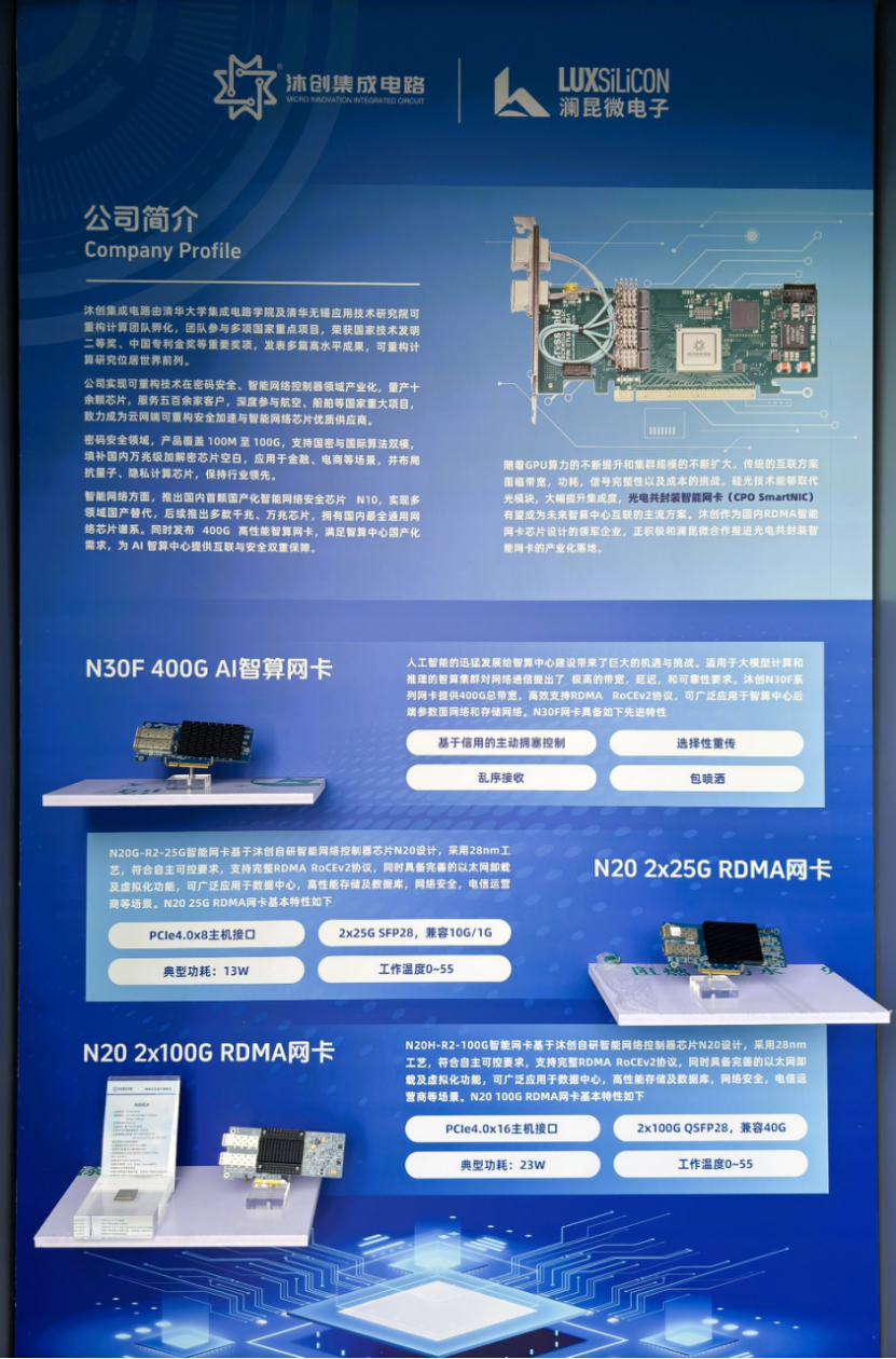 近日,国内领先的可重构安全加速与智能网络芯片供应商——沐创集成电路(以下简称沐创),联合澜昆微电子,正式首发最新一代光电共封装(CPO)智能网卡,并携多款高性能RDMA网卡产品入驻中关村智造大街,面向公众及产业伙伴展出。