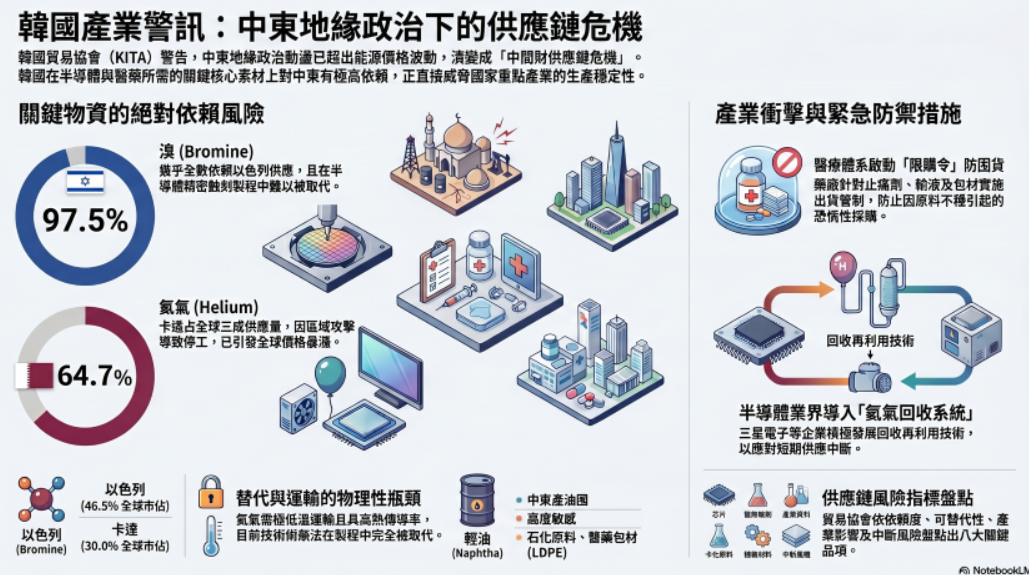 根据最新数据与韩国贸易协会的分析,韩国在半导体、医疗、电子与化学等国家重点产业中不可或缺的核心基础素材,特别是“氦气”与“溴”对于中东地区的进口依赖度达到绝对且危险的水平,其中溴的依赖度高达近98%,而氦气也近65%。此外,由于担忧石化原料轻油(Naphtha)的供应中断,韩国制药业界已经开始采取紧急措施,严防医药品及相关包材的囤积与抢购潮,确保稳定的供应链已成为韩国产业界当前的首要生存课题。
