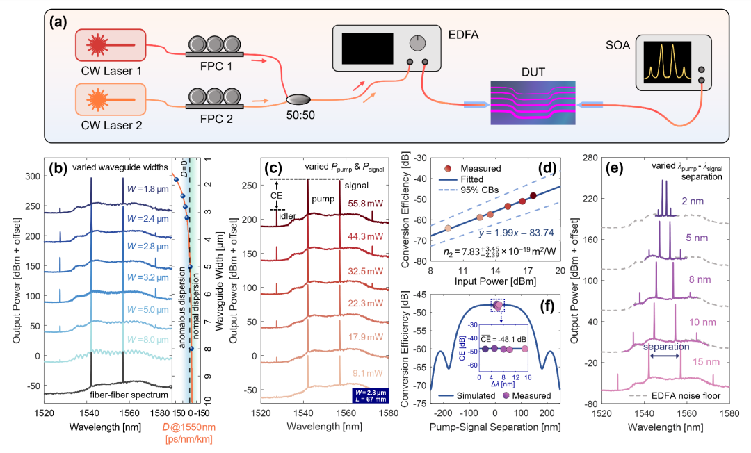 图4 不同波导宽度和波长分离下的四波混频实验结果。(a)采用两束可调激光源和光纤偏振控制器的实验装置;(b-e)不同波导宽度和波长分离对四波混频转换效率的影响,波导宽度的变化显著影响色散特性,2.8 μm宽的波导实现了最佳转换效率(−47.9 dB)