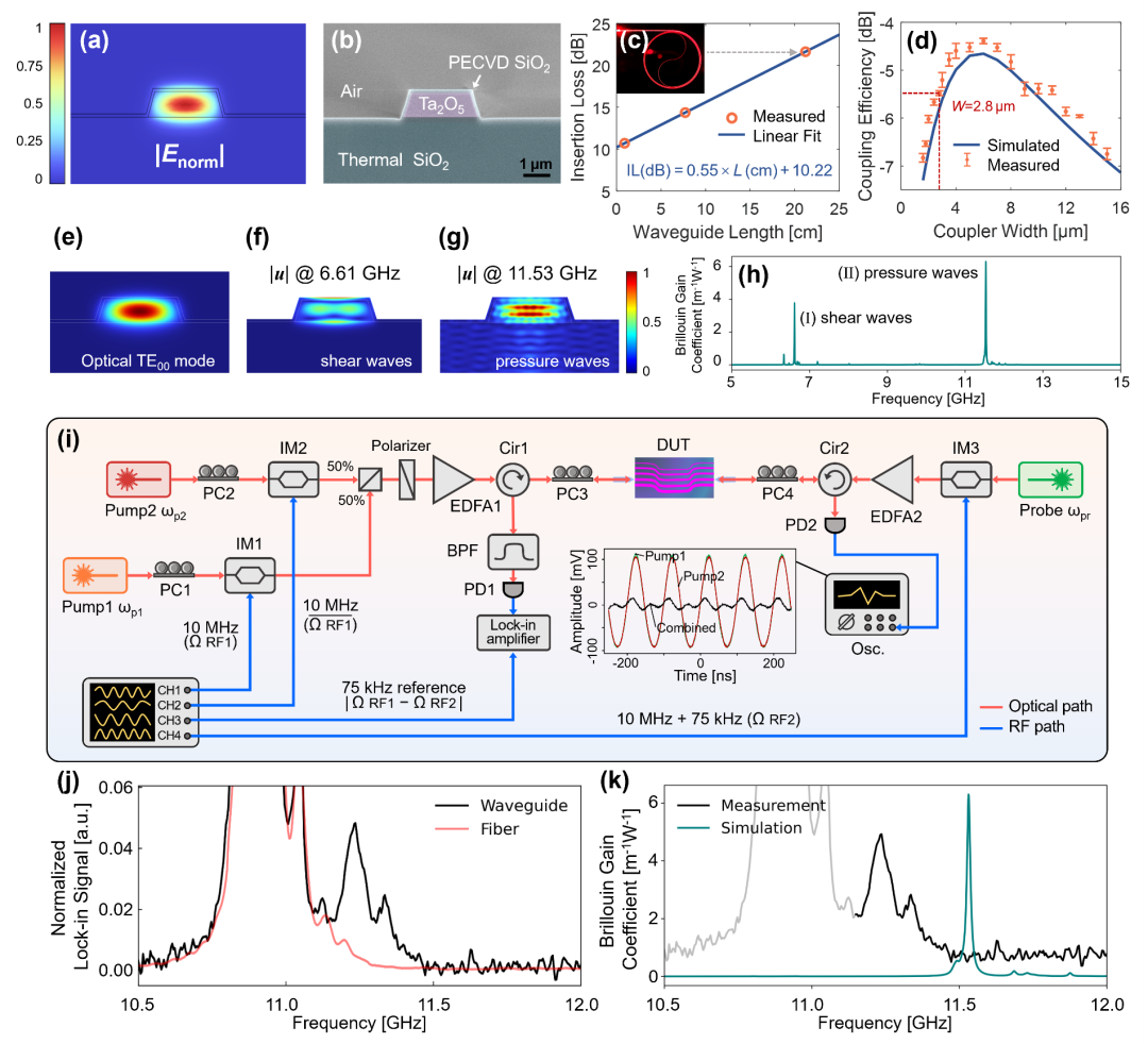 图3 五氧化二钽波导中的布里渊散射。包括(a-d)波导结构、插入损耗、耦合效率;波导的光学模式和声学模式的仿真结果(e-g);(h)布里渊增益谱;(j)在11.23 GHz的布里渊频移处观察到明显的反向布里渊增益