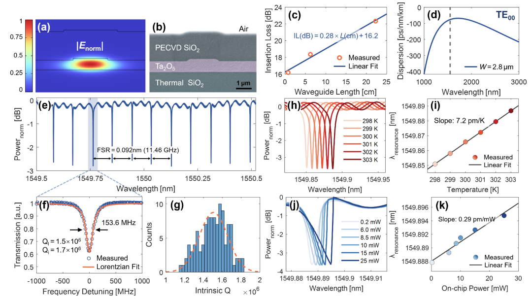 图2浅刻蚀Ta2O5脊形波导的特性,包含电场分布、波导的横截面SEM图像、波导长度与插入损耗的关系、TE00模式的色散特性、微环谐振器的传输谱、微环谐振器的谐振曲线与Lorentzian拟合、微环谐振器的本征品质因子分布等。提取的温度依赖波长偏移(TDWS)为7.2 pm/K,提取的功率依赖波长偏移(PDWS)为0.29 pm/mW
