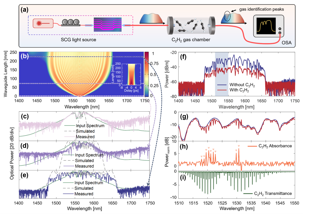 图5 超连续谱生成(SCG)和乙炔气体光谱检测实验。(a)实验装置;(b)不同波导长度下的仿真SCG谱;(c-e)不同波导长度下的输入、模拟与实测SCG光谱对比;(f)通过波导前后乙炔气体吸收的SCG谱对比;(g-i)乙炔气体吸收与透射光谱的归一化结果、乙炔气体参考透射光谱