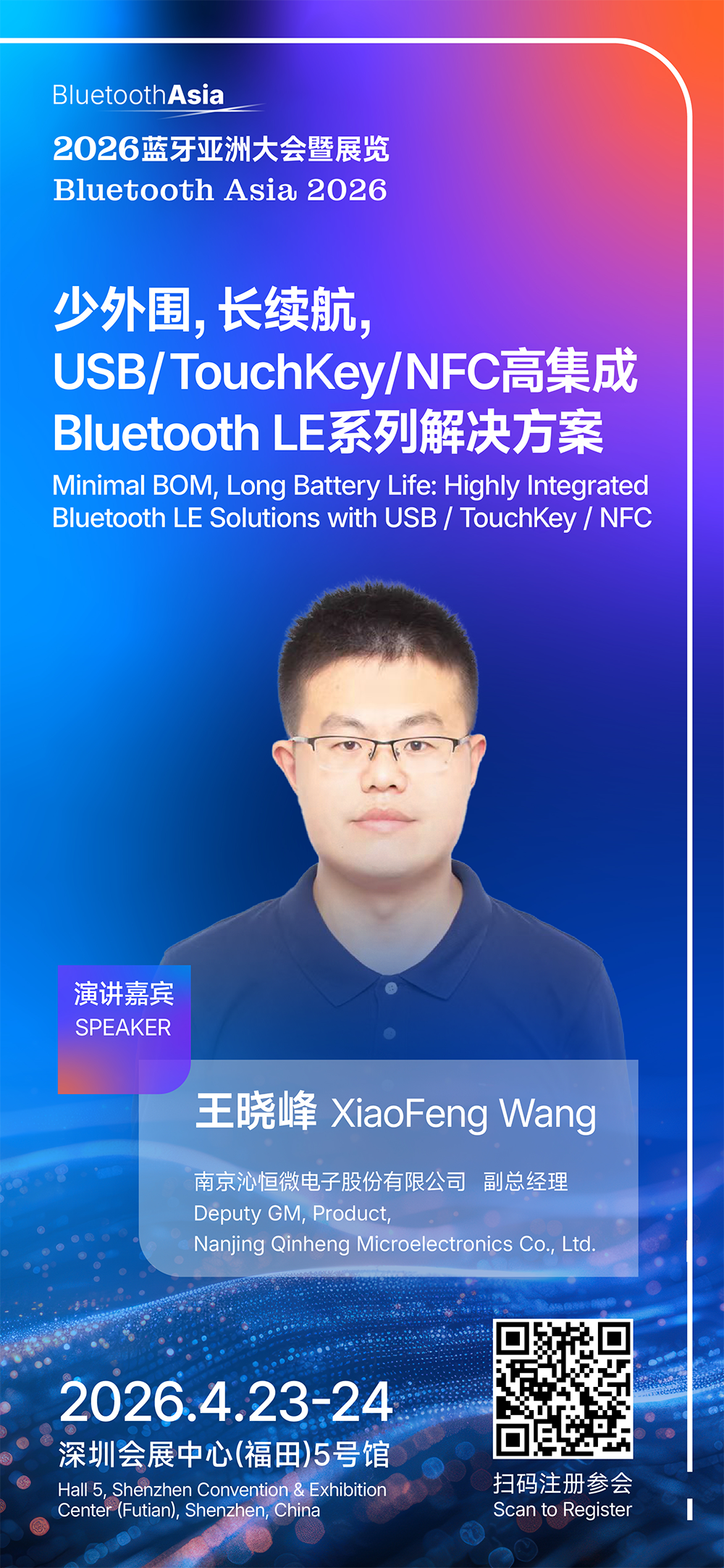 4月23–24日,2026蓝牙亚洲大会(Bluetooth Asia 2026)将在深圳会展中心(福田)5号馆盛大举行。沁恒亮相5F05展位,带来融合MCU与蓝牙优势的无线SoC产品及专业解决方案,并将发表《少外围,长续航,USB/TouchKey/NFC高集成BLE系列解决方案》主题演讲,分享低功耗、高集成、长续航无线SoC的独特构建方式及丰富应用,助力下游客户解锁万物互联新机遇,诚邀各位莅临5F05展位交流探讨。