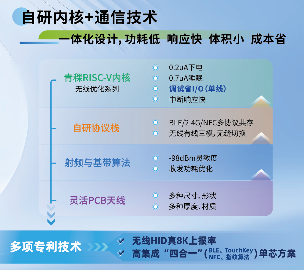 沁恒深耕MCU领域多年,自研青稞RISC-V处理器针对多场景应用灵活优化;在蓝牙SoC方向,自研RF射频、基带算法、协议栈及多形态PCB天线技术。依托MCU与蓝牙领域的专利技术,通过自研内核和通信技术的一体化设计,无线SoC产品功耗低、响应快、体积小、成本省。通过集成Type-C PD、防水级触摸、NFC和指纹算法等特色功能,单芯片即可满足各类连接联网应用需求。