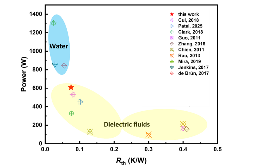 随着高性能计算芯片的功率密度持续攀升,芯片级热管理正成为制约电子系统性能与可靠性的关键瓶颈。两相冷却能够利用相变潜热实现高效传热,被认为是高热流密度电子器件散热的重要发展方向。然而,在实际电子系统中,传统水冷方案虽然换热能力突出,却存在导电风险;绝缘工质虽具有电气安全优势,但普遍面临导热系数低、汽化潜热有限等问题。如何在保证电气绝缘的前提下进一步提升两相散热能力,仍是当前热管理研究中的重要难题。