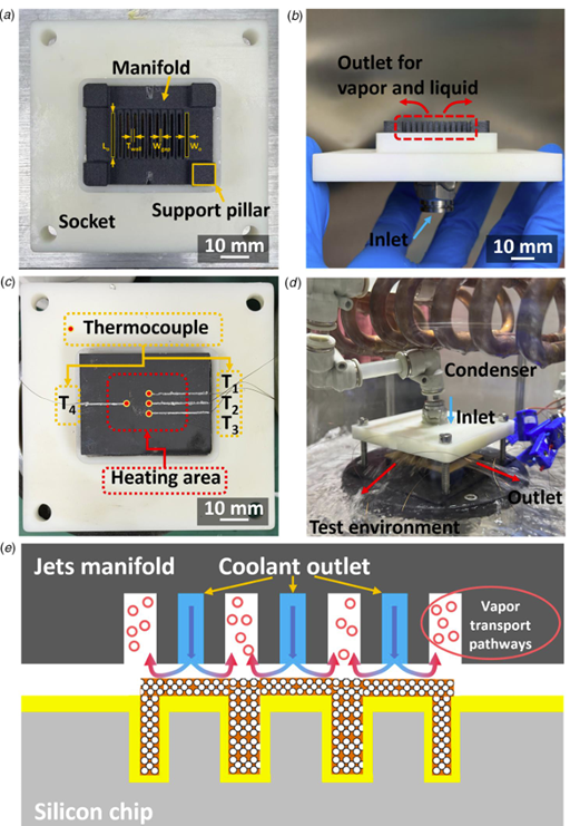 针对上述挑战,北京大学集成电路学院、微米纳米加工技术全国重点实验室、集成电路高精尖创新中心王玮-张驰团队提出了一种基于多孔结构复合微翅片的芯片级两相射流冲击散热方案。该工作围绕供液歧管设计、表面强化沸腾及低热阻传热路径构建,设计并通过3D打印制备了分布式供液歧管,实现液汽分离路径以降低热阻;通过多孔结构与芯片背面刻蚀的硅翅片实现原位共形集成,在增大散热面积的同时增加汽化核心,提升了散热能力。最终该散热方案实现了无热界面材料(TIM)、无盖板的芯片级直接两相射流冷却散热封装,使用绝缘冷却工质Novec 649,实现散热功率610 W、芯片结温69℃、热阻0.07 K/W的高效散热。其中,在552 W输入功率下,芯片加热区域温差仍控制在10 K以内,展现出该结构在高热流密度条件下兼顾散热能力与温度均匀性的能力。