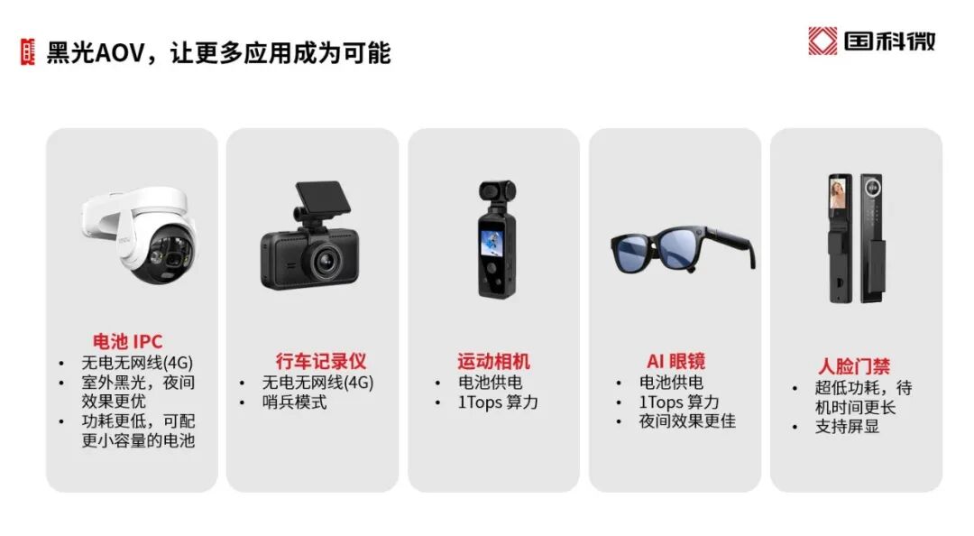 吴炜表示,黑光与低功耗的“双剑合璧”,正将AI视觉的边界从传统安防推向更广阔的天地。国科微为此构建了“高端+普惠”并行的完整产品矩阵:GK7606V1面向高端安防与后装车载,支持4K@45fps编解码与2.5T算力;GK7206V1主打普惠型黑光AOV市场,让黑光全彩不再是高端设备专属。通过黑光与低功耗技术的融合,GK7206V1在电池IPC、行车记录仪、运动相机、AI眼镜以及人脸门禁等产品中实现了更优的性能表现。