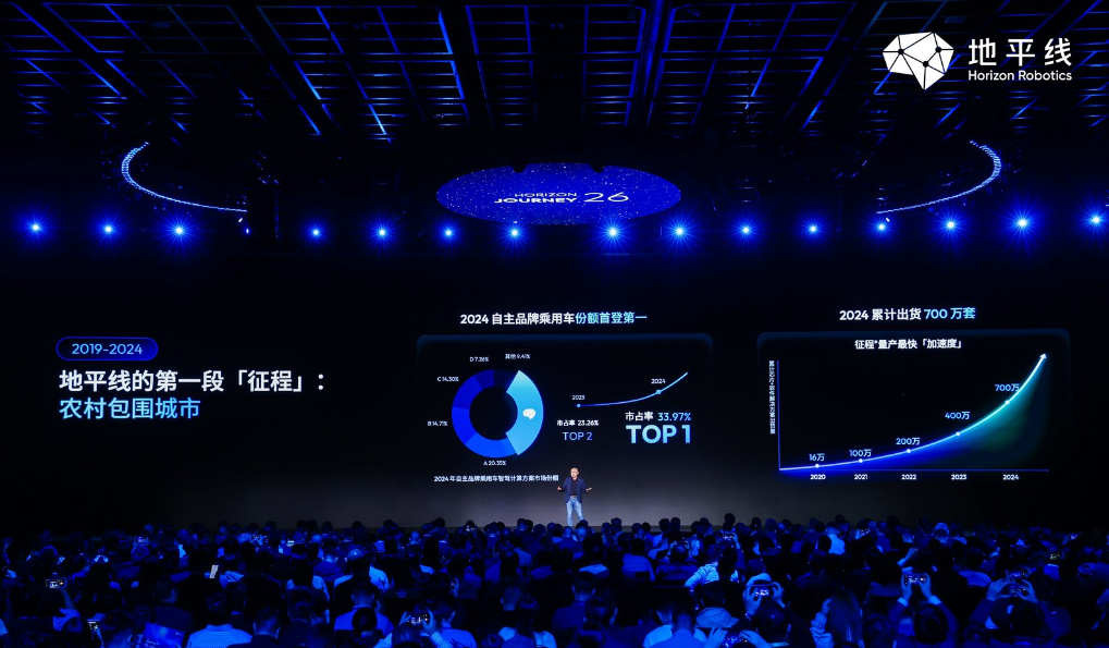 回望地平线的成长之路,既是企业自身的跨越进阶,更是中国智驾产业突破与崛起的缩影。2019年至2024年,地平线开启第一段征程,以“农村包围城市”的战略,从中小算力ADAS市场切入,市占率登顶自主品牌乘用车智驾计算市场TOP1。2022年开始,地平线开启第二段征程,向高而行,纵身一跃,挑战大算力芯片与城区NOA。2025年11月,国内首个一段式端到端HSD量产落地,智驾里程占比即将跨越50%的历史性门槛。在提供HSD作为高配选项的车型中,77%的用户主动选择了搭载HSD的版本。地平线创始人兼CEO余凯博士提出:今年,地平线将再次战略升维,推出舱驾融合整车智能体芯片和操作系统。