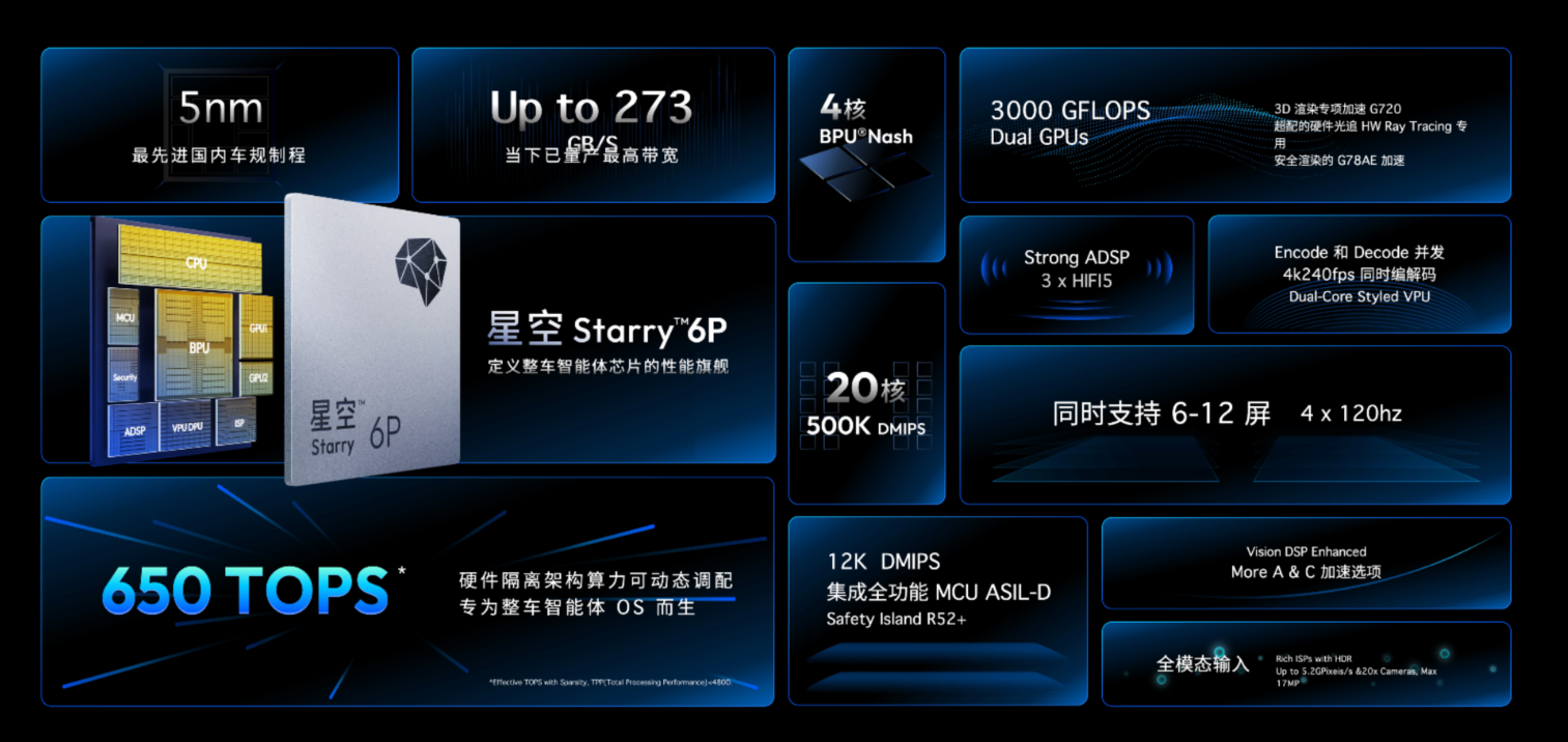 地平线星空系列基于全阶产品布局,推出星空Starry 6P、6H芯片。星空Starry 6P作为中国首款舱驾融合整车智能体芯片,以5nm制程、650TOPS算力和273GB/s带宽,实现顶级智舱、智驾与端侧大模型性能的全面领先。通过集成架构创新,实现了空间、器件与成本的三重优化。星空Starry围绕舱驾融合真实落地需求打造,业内首创自适应计算引擎,首创城堡Fortress安全物理隔离架构,实现座舱、智驾物理隔离,独立运行。整车智驾域达ASIL-D最高等级,做出座舱重启不影响智驾功能的安全承诺。地平线星空Starry依托更统一成熟的量产体系,目前已收获多家主流车企及一级供应商的意向量产合作。