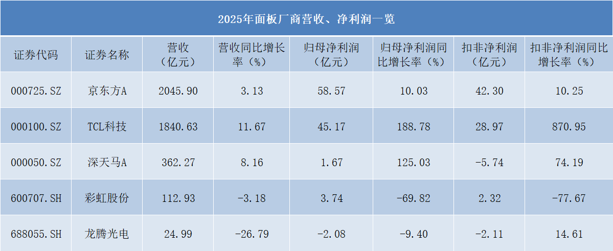 2025面板厂商业绩透视:京东方/TCL双强领跑 彩虹/龙腾等承压