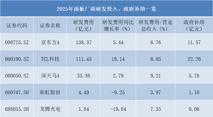 政府补助方面,TCL科技获得22.26亿元,京东方A为11.57亿元,深天马A为5.78亿元,彩虹股份和龙腾光电分别获得1.18亿元和0.06亿元。结合利润来看,TCL科技与京东方A的政府补助规模较大,但相较于其百亿级利润体量,整体依赖度可控。而深天马A的1.67亿元归母净利润中,若扣除5.78亿元政府补助,实际主业仍处亏损状态。