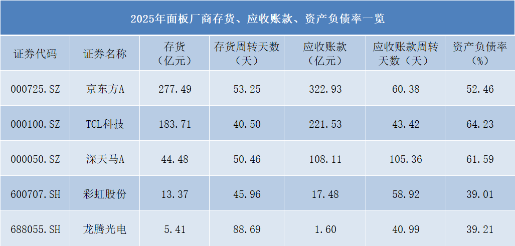 营运能力是衡量面板企业“内功”的关键指标,也是本轮分化中容易被忽视的深层原因。从存货周转天数来看,TCL科技表现最优为40.50天,彩虹股份为45.96天,深天马A为50.46天,京东方A为53.25天,而龙腾光电则高达88.69天,远高于行业平均水平,结合其营收大幅下滑,说明产品动销不畅,库存去化压力较大,未来可能面临进一步减值风险。