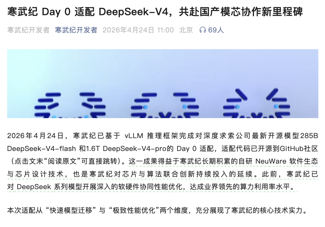 V4发布当日,华为昇腾、寒武纪、海光信息、摩尔线程、沐曦股份、昆仑芯、平头哥真武、天数智芯8家国产AI芯片品牌,以及英伟达,均宣布完成对DeepSeek-V4的适配。尤其值得注意的是,这是大模型产业首次实现“Day 0”级别的全栈适配:模型发布即适配上线,芯片厂商不再需要数月的“追逐式”调试周期。