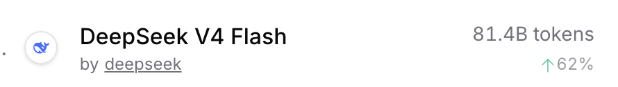 据OpenRouter平台数据,DeepSeek V4 flash今日调用量较前一天上涨了62%。