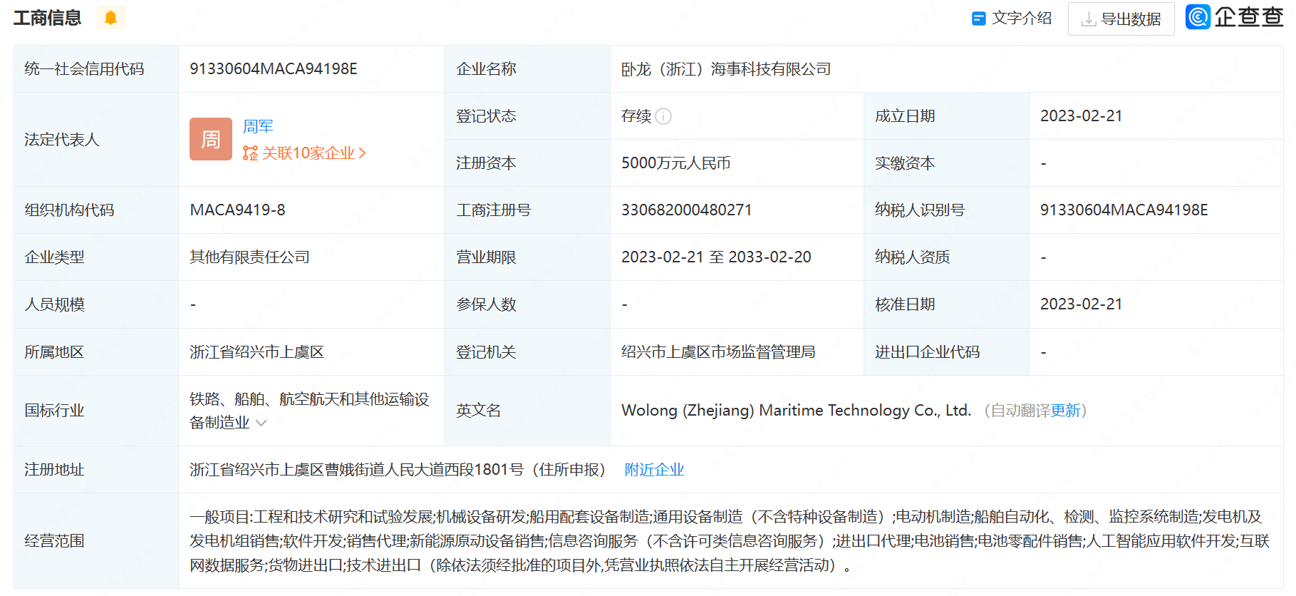 (文/白雨轩)企查查显示,近日,卧龙(浙江)海事科技有限公司成立,注册资本5000万元,经营范围包含:船用配套设备制造;船舶自动化、检测、监控系统制造;新能源原动设备销售;电池销售等。