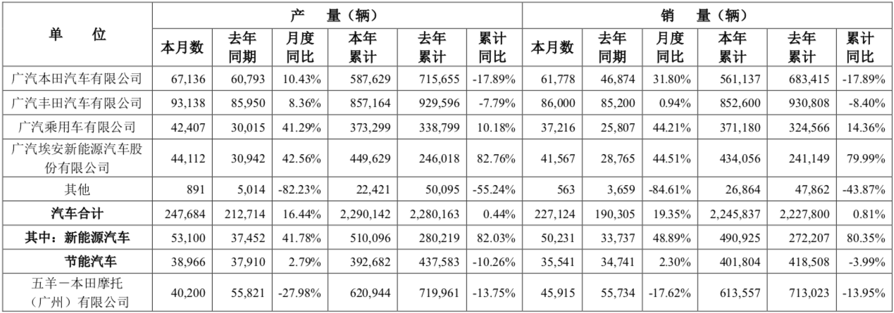12月5日,广汽集团发布11月产销快报称,公司2023年11月汽车产量为247,684辆,同比增长16.44%,本年累计产量为2,290,142辆,同比增长0.44%;11月汽车销量为227,124辆,同比增长19.35%,本年累计销量为2,245,837辆,同比增长0.81%。