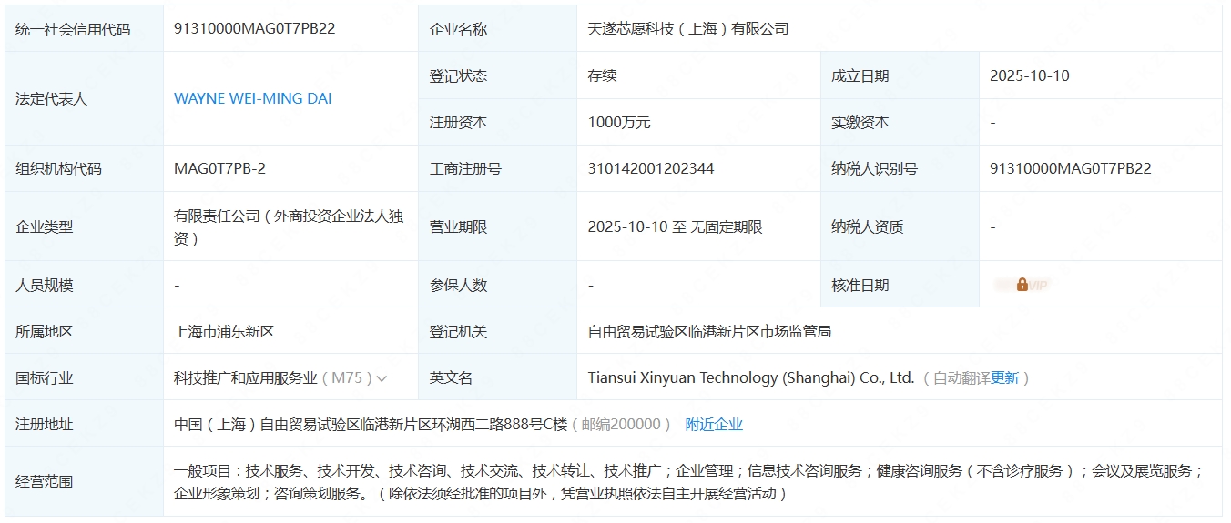 (文/罗叶馨梅)10月10日,据天眼查信息显示,天遂芯愿科技(上海)有限公司近日成立,注册资本1000万元人民币,经营范围包括企业管理、信息技术咨询服务、健康咨询服务(不含诊疗服务)以及会议及展览服务等。该公司由芯原股份(688521.SH)全资持股。