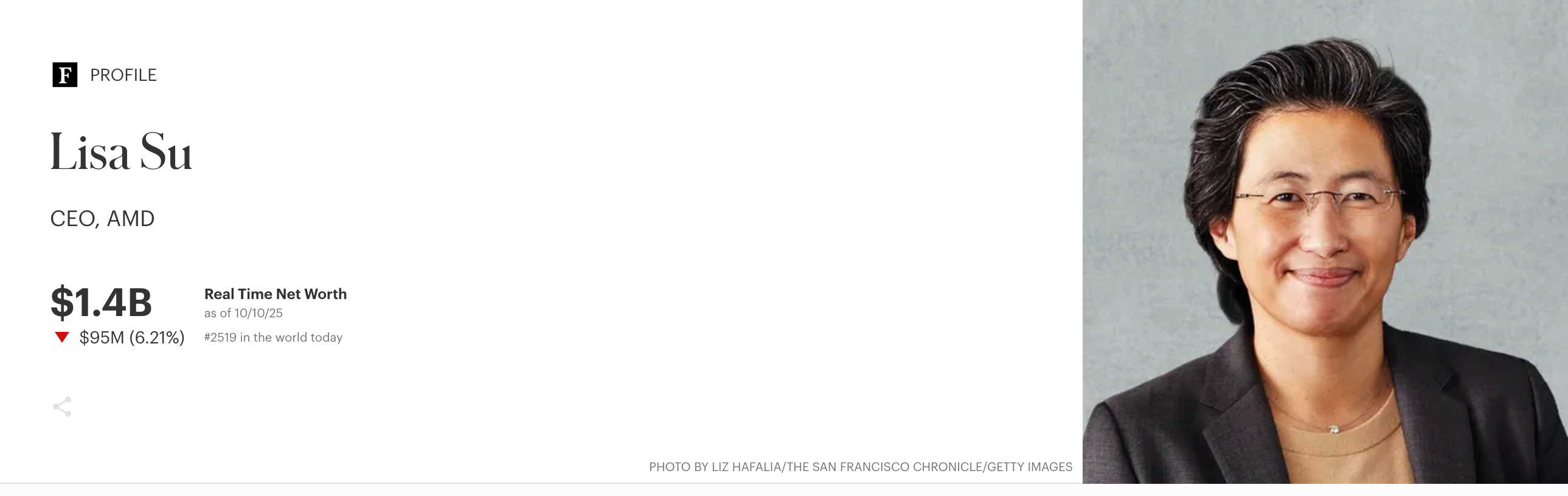 随着投资者日益认同苏姿丰构建“AI硬件-软件-服务”生态体系的战略愿景,AMD股价今年已近乎翻倍。虽然苏姿丰短期内难以跻身富豪榜前十,但若其持股持续增值,其身家有望再增加数十亿美元。