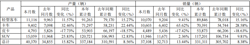 轻型客车:11月产量11,116辆,同比增长11.57%,本年累计产量91,263辆,同比增长15.27%;销量方面,11月售出10,070辆,同比增长9.41%,本年累计销量89,846辆,同比增长15.16%,产销均保持稳定增长。