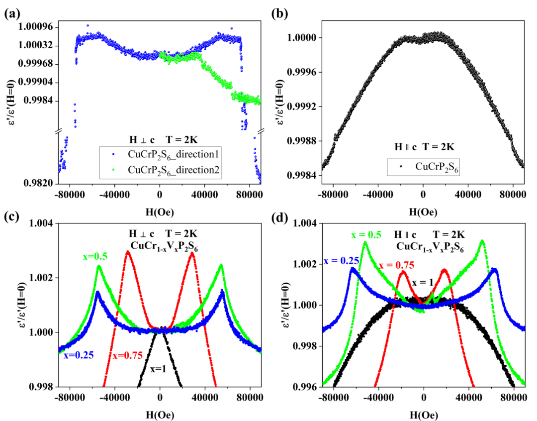 图2 (a)-(b) CuCrP₂S₆在100 kHz频率下、磁场H平行/垂直于c轴时的归一化磁介电谱。(c)-(d) CuCr₁₋ₓVₓP₂S₆(x=0.25–1)在100 kHz频率下、磁场H平行/垂直于c轴时的归一化磁介电谱。