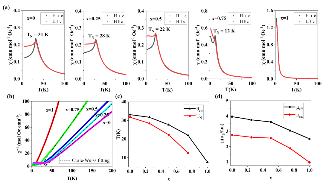 图1 (a) CuCr₁₋ₓVₓP₂S₆单晶在平行和垂直于c*轴方向施加1 kOe磁场下测得的零场冷磁化率。(b) 磁化率倒数随温度变化的居里-外斯拟合结果。(c) 从居里-外斯拟合中提取的奈尔温度TN、居里-外斯温度θcw,以及(d) 有效磁矩μeff和从等温磁化曲线得到的饱和磁矩μsat 随CuCr₁₋ₓVₓP₂S6组分x的变化关系。
