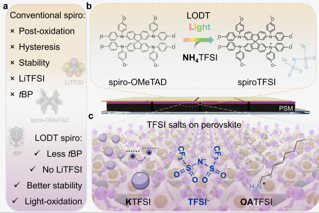 图1 光加速氧化掺杂(LODT)策略及TFSI盐协同调控钙钛矿光伏器件的机制示意图