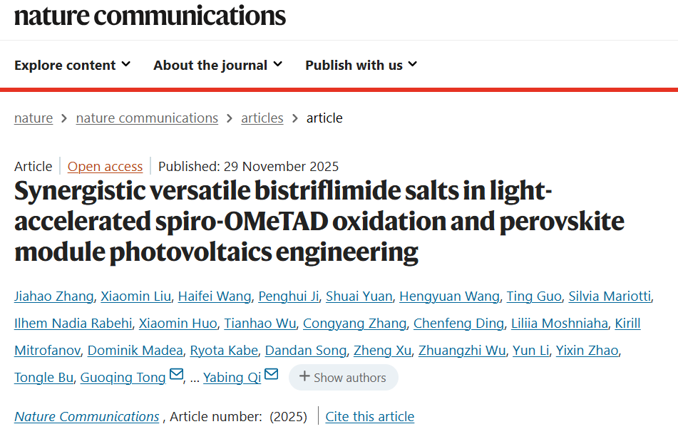 2025年11月,上海交通大学溥渊未来技术学院/张江高等研究院戚亚冰教授联合冲绳科学技术大学院大学、合肥工业大学等多家单位,在钙钛矿太阳能电池领域取得重要突破。相关研究成果以“Synergistic versatile bistriflimide salts in light-accelerated spiro-OMeTAD oxidation and perovskite module photovoltaics engineering”为题发表于学术期刊《Nature Communications》上,为钙钛矿太阳能电池中空穴传输层(HTL)的现存挑战提供了核心解决方案。