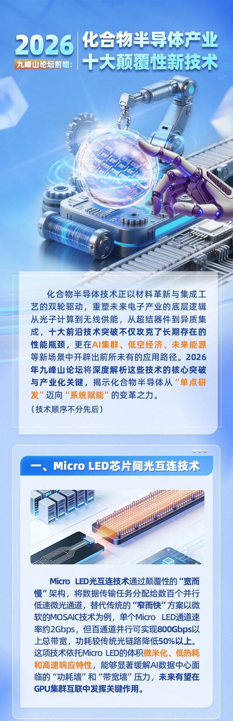 九峰山论坛 | 论坛前瞻:化合物半导体产业2026十大颠覆性新技术 作者: 爱集微 57分钟前 相关舆情 AI解读 生成海报 来源:九峰山论坛 #九峰山论坛# 评论 收藏 点赞 1644 责编: 爱集微 来源:九峰山论坛 #九峰山论坛# 收藏 点赞 分享至: 微信扫一扫分享 THE END 相关推荐 英诺赛科深入解析氮化镓市场,为数据中心、机器人新应用注入芯活力! 产业灯塔在光谷点亮,2025九峰山论坛开幕,全球化合物半导体行业龙头悉数到场 2025九峰山论坛暨化合物半导体产业博览会即将盛大启幕 九峰山论坛2025 | 四月光谷,激活未来! 顶峰见!2025CSE邀您九峰山“论剑”! 2024九峰山论坛开幕,9位院士齐聚,12个项目签约,万人参会! +关注 爱集微 微信: 邮箱:laoyaoba@gmail.com 12.1w文章总数 12012.5w总浏览量 最近发布 华勤技术携手小米成功举办openvela城市沙龙无锡站 54分钟前 九峰山论坛 | 论坛前瞻:化合物半导体产业2026十大颠覆性新技术 57分钟前 奕斯伟计算持续助力荣耀 为500系列打造清晰流畅护眼视觉体验 3小时前 曙光海光终止合并之后:国产算力生态以另一种方式打开 4小时前 商汤产品发布周前瞻:技术实用主义重塑AI产品 4小时前 获取更多内容 最新资讯 喜报!艾为电子荣膺“上证鹰·金质量公司治理奖” 14分钟前 海外芯片股一周动态:英伟达获准对华出售H200芯片,三星4nm制程良率提升至60%~70% 48分钟前 【上市企业热度观测日志】12月10日:海光、曙光热度登顶,折射国产算力生态新动向 50分钟前 华勤技术携手小米成功举办openvela城市沙龙无锡站 54分钟前 亚光科技选举胡代荣为董事长 石凌涛接任总经理 2小时前 紫光国微出资设立锐视特微电子 拓展集成电路设计制造领域 2小时前