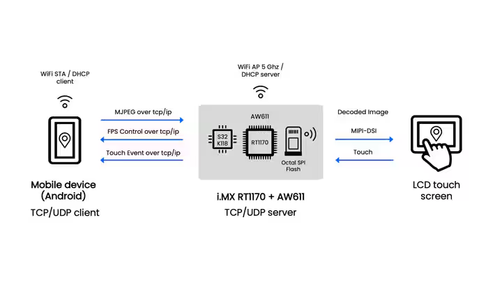 4.触摸反馈与控制——LCD上的触摸事件由i.MX RT1170 MCU捕获。这些事件通过TCP/IP发送回手机,实现对手机的远程控制。