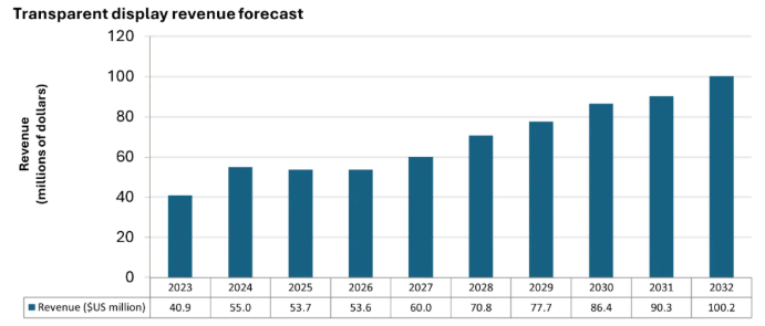 12月30日,市调机构Omdia在报告中指出,2032年,透明显示屏市场预计收入将达到1亿美元,从2025年到2032年的复合年均增长率(CAGR)为9.3%。尽管出货量仍有限,但市场在收入和总显示面积方面预计将实现显著增长。增长主要由公共场所显示器大型化所推动,并得益于透光率的持续提升和面板尺寸的扩大。