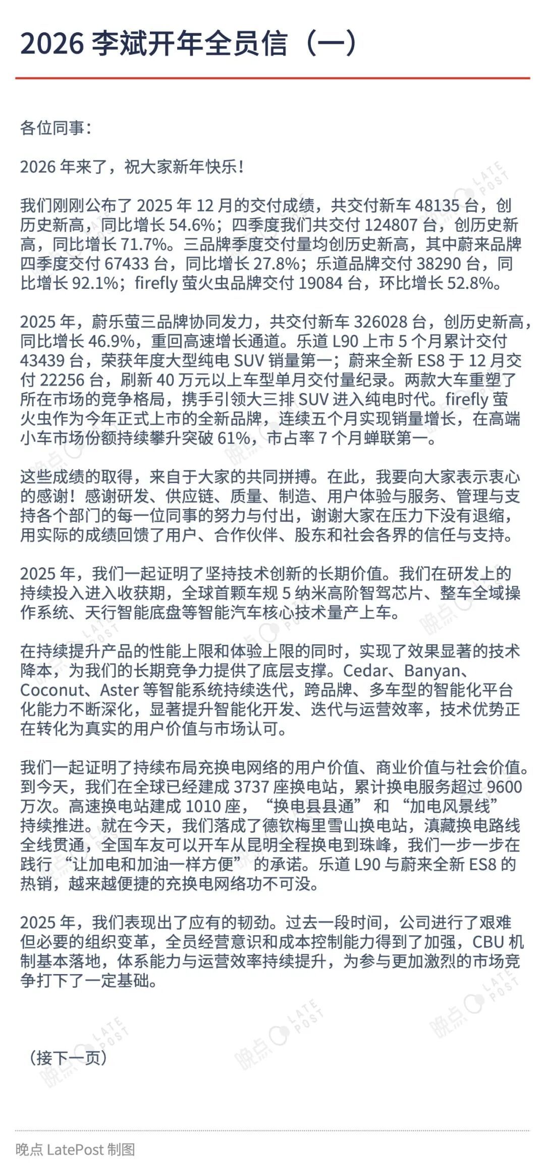 据“晚点Auto”,蔚来创始人、董事长、CEO李斌发布2026年全员信,并预告再过几天将迎来第100万辆量产车下线。