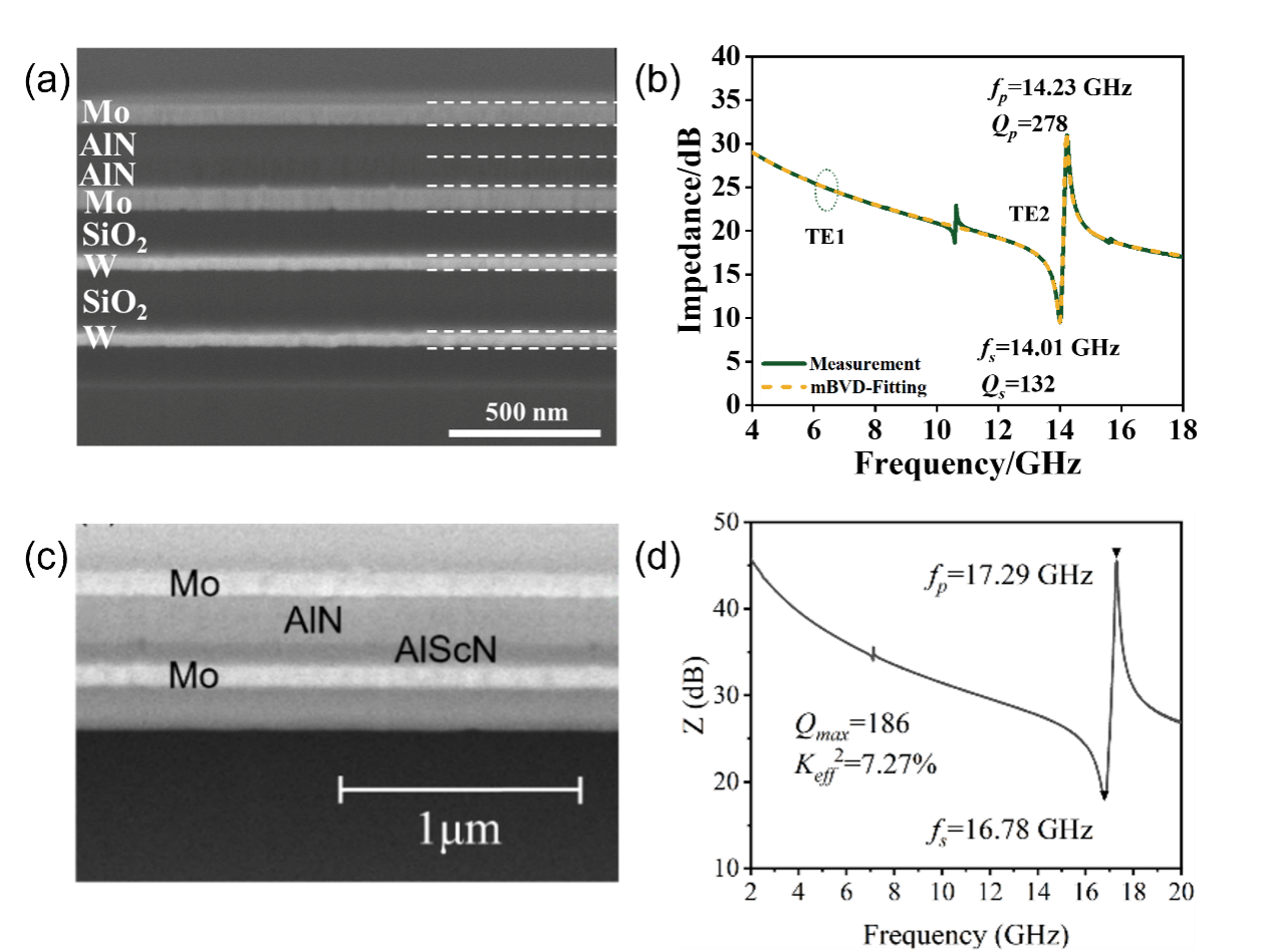 在此基础上,团队于今年进一步优化工艺与结构设计,通过构建周期极化AlN/AlN及AlN/AlScN压电叠层结构,实现了14.0-16.8 GHz的超高频射频谐振器(doi:10.1109/IUS62464.2025.11201736),如图2所示。其中,AlN/AlN固态装配型谐振器(SMR-BAW)谐振频率为14.0 GHz,品质因子Qmax达到266,keff2为3.87%;AlN/AlScN FBAR谐振器的Qmax达到186,keff2为7.27%。相较于传统器件,新型叠层结构在同等频率下允许采用更厚的压电薄膜,大幅提升了器件的功率耐受性;同时,将频率对膜厚变化的敏感度降低了近一半,为高频、大规模、高一致性的制造奠定了关键技术基础。