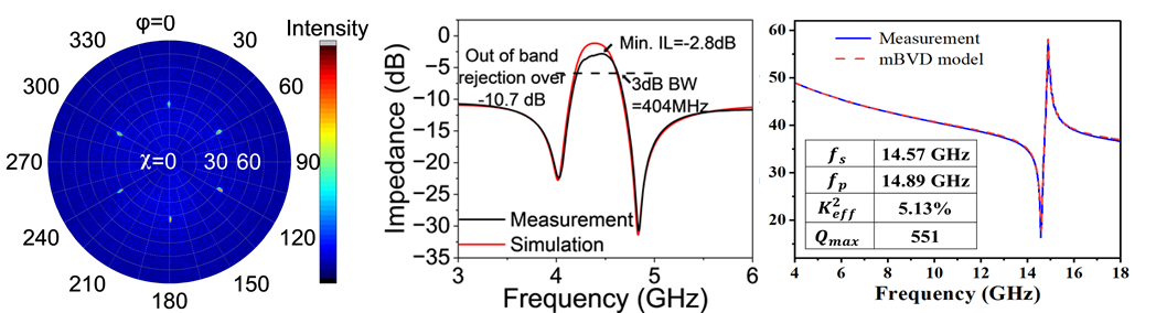 在2024年,团队提出新型两步法提升 AlScN 压电薄膜的外延质量,研制出谐振频率4.39 GHz、有效机电耦合系数(keff2)高达21%的AlScN BAW谐振器,并实现了3dB带宽高达9.0%的射频滤波器(IEEE TED, doi: 10.1109/TED.2024.3443237)。同时,团队攻克周期极化叠层氮化铝的生长难题,成功将单晶氮化铝谐振器的工作频率进一步推高至14 GHz(品质因子Qmax=551),并通过高钪掺杂实现了高达9.7%的keff2(2024 IEEE UFFC-JS, doi:10.1109/UFFC-JS60046.2024.10793659; 10.1109/UFFC-JS60046.2024.10793833),如图1所示。