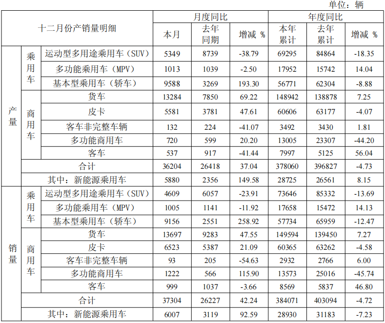 销量方面,12月合计销量为37304辆,同比去年同期26227辆增长42.24%;全年累计销量384071辆,较去年累计403094辆下降4.72%。