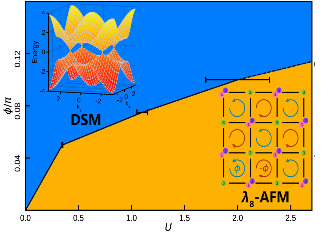 研究团队聚焦SU(N)狄拉克费米子Hubbard模型。当N为偶数时,该模型无符号问题,已有大量研究揭示了其丰富的相图和临界性质。当N为奇数时,该模型有符号问题,其相图和相变性质仍未知。基于虚短时临界动力学方案,研究团队成功揭示SU(3)狄拉克费米子Hubbard模型的基态相图,发现了该模型的有序相存在一类新的λ8-反铁磁序(如图2)。此外,该研究还进一步揭示了狄拉克半金属相与λ8-反铁磁序之间的量子相变的临界性质,并发现这个量子临界点属于新的Chiral SU(3)普适类,超越传统狄拉克费米子临界性的Gross-Neveu理论。