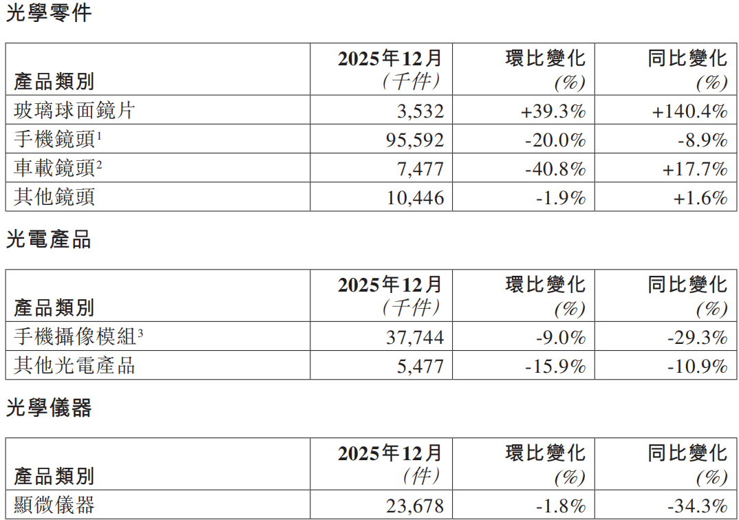 2025年全年出货数据同样在公告中揭晓,光学零件类别里,玻璃球面镜片全年出货29,592千件,手机镜头以1,262,249千件的出货量成为核心产品之一,车载镜头全年出货130,186千件,其他镜头全年出货121,759千件;光电产品中,手机摄像模组全年出货485,845千件,其他光电产品全年出货56,754千件;光学仪器方面,显微仪器全年出货235,587件。