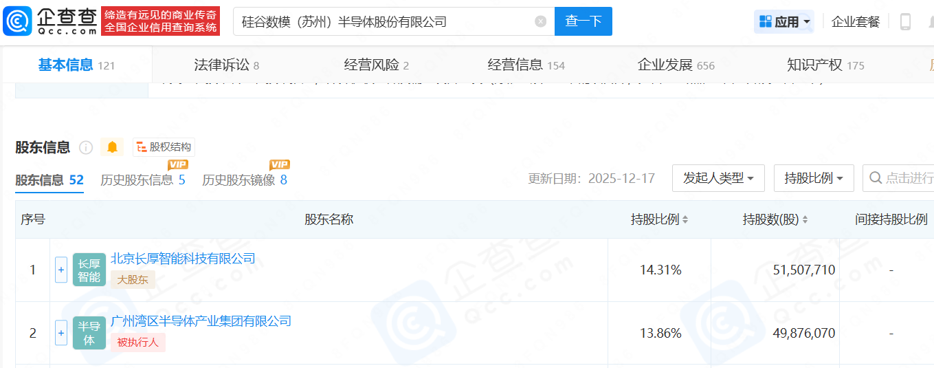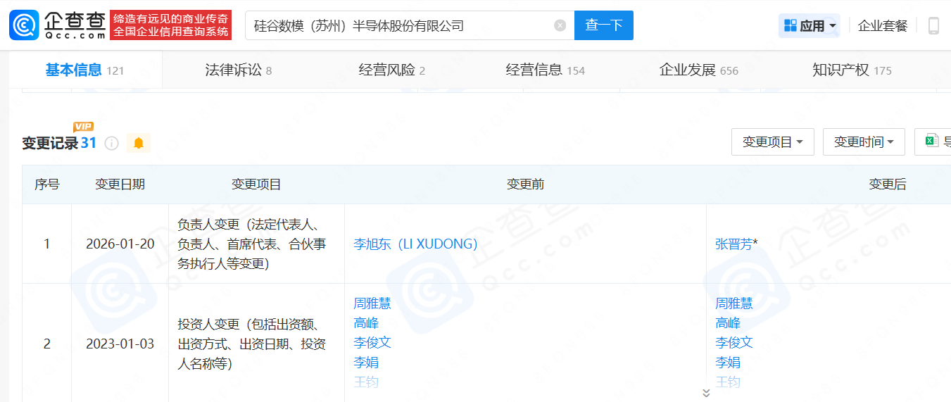 企查查公开资料显示,1月20日,硅谷数模(苏州)半导体股份有限公司进行了负责人变更,负责人由李旭东变更为张晋芳。