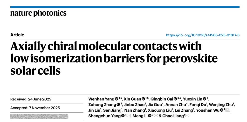 该研究成果以《低异构化势垒的轴向手性分子实现高效稳定的钙钛矿太阳能电池》(“Axially chiral molecular contacts with low isomerization barriers for perovskite solar cells”)为题于1月19日在《自然光子学》()期刊上在线发表。西安交通大学物理学院博士研究生杨文涵为论文的第一作者;物理学院博士研究生关心和福建农林大学青年教师蔡庆斌为论文的共同第一作者;物理学院梁超教授、杨生春教授、吴宥伸副教授以及河南大学李萌教授为论文的共同通讯作者;西安交通大学物理学院和电工材料电气绝缘全国重点实验室为本论文第一完成单位。工作同时得到了物理学院张磊教授和张楠副教授的指导。西安交通大学分析测试中心郭航、梁艳和周佩老师在材料结构测试与分析方面提供了大力支持。本研究得到了国家重点研发计划、国家自然科学基金、西安交通大学青年拔尖人才支持计划、中央高校基本科研业务费以及电工材料电气绝缘全国重点实验室等项目的资助。