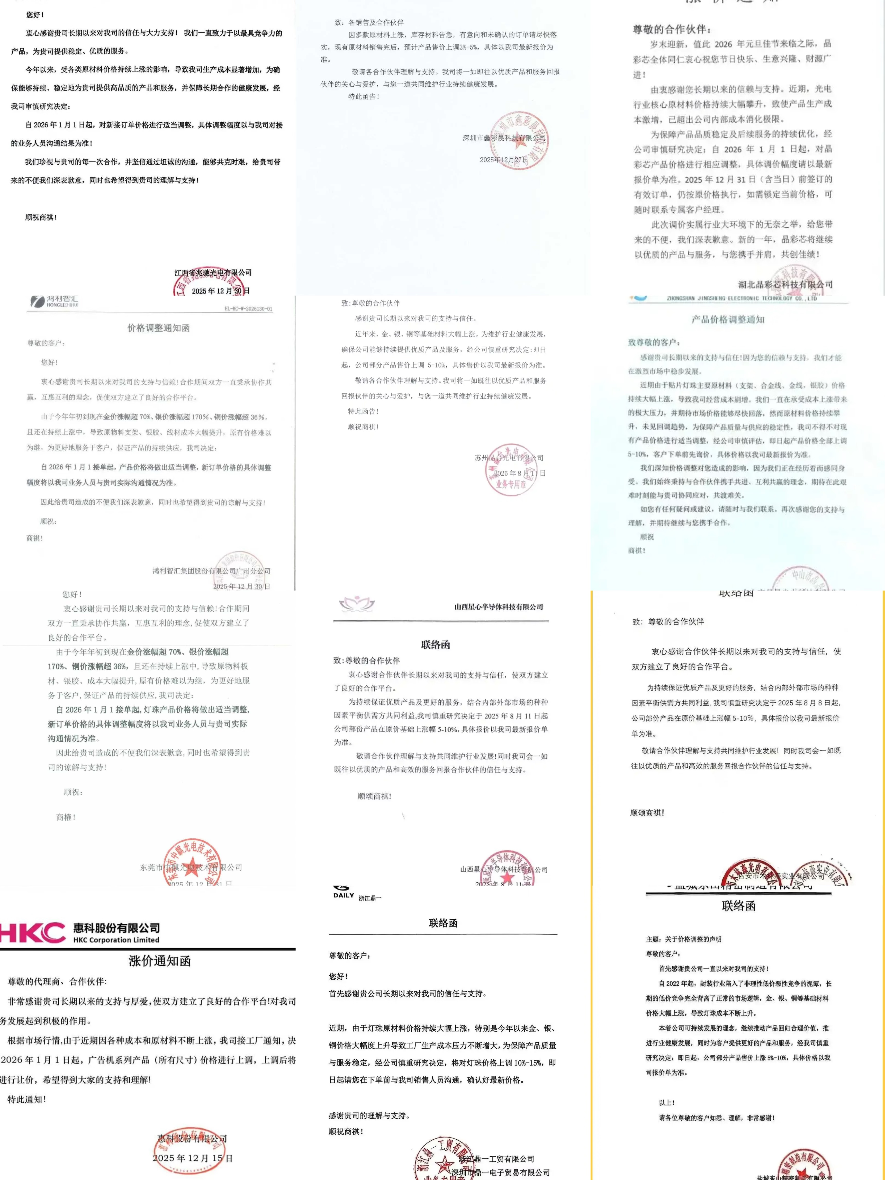 截至目前,包括兆驰股份、鸿利智汇(斯迈得)、创维、大华、惠科、星心半导体、中麒光电、木林森、国星光电、晶台光电、蓝科途安光电、江苏高格芯微、晶晟光电、深圳大合半导体、浙江鼎一、湖北晶彩芯、三安光电、玛雅、未徕照明、晖昂光电、泓硕光电、明安光电、宏新盛、正泰电器、德力西、中山市秀柏照明、佛山晖昂光电、河南山海照明等数十家LED企业已发布涨价函,涨价范围涵盖芯片、封装、模组到终端应用全链条,调价生效时间集中在2025年12月中旬至2026年1月1日,目前多数新增订单已执行更新后的价格体系。