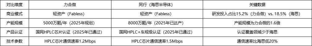 国内竞争中,力合微与海思半导体均为Fabless模式,但在产能、认证和技术参数上存在差异:产能方面,海思2025年达产8000万颗/年,是力合微规划产能的1.6倍;认证方面,海思已覆盖国网HPLC和车规级认证,而力合微仅通过国网认证;技术参数方面,海思HPLC芯片通信速率1.5Mbps,比力合微高20%。从差异原因看,海思研发投入占比(18.5%)高于力合微(15.2%),且背靠华为生态,在技术研发和客户资源上更具优势;力合微则专注于国网招标市场,2025年国网招标中力合微中标占比21%,略高于海思(19%),在民用PLC芯片领域仍保持竞争力。