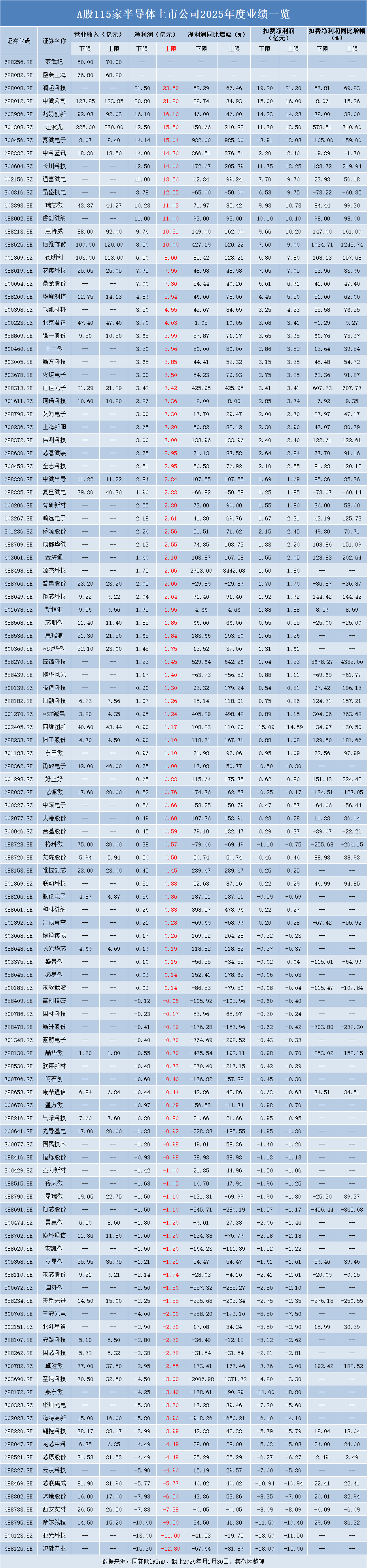 A股115家半导体公司2025年度业绩一览:70家预盈 净利最高激增34倍!