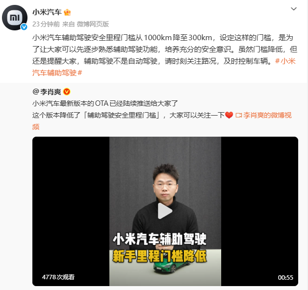 小米汽车通过官方微博宣布,其车辆辅助驾驶功能的“安全里程门槛”已由最初的1000公里降低至300公里。此次调整旨在降低用户使用辅助驾驶功能的初始门槛。