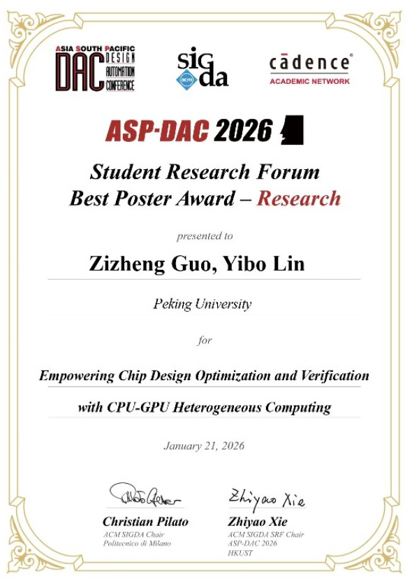 在本届大会上,北京大学集成电路学院EDA团队表现优异,梁云教授团队荣获大会最佳论文奖(Best Paper Award),博士生郭资政荣获学生科研论坛最佳海报奖(SRF Best Poster Award),林亦波副教授团队受邀发表特邀论文并发布了面向工业级设计的异构加速静态时序分析引擎HeteroSTA。 这些成果标志着学院在异构计算辅助芯片设计、高层次综合以及芯片性能分析领域取得了一系列重要进展。