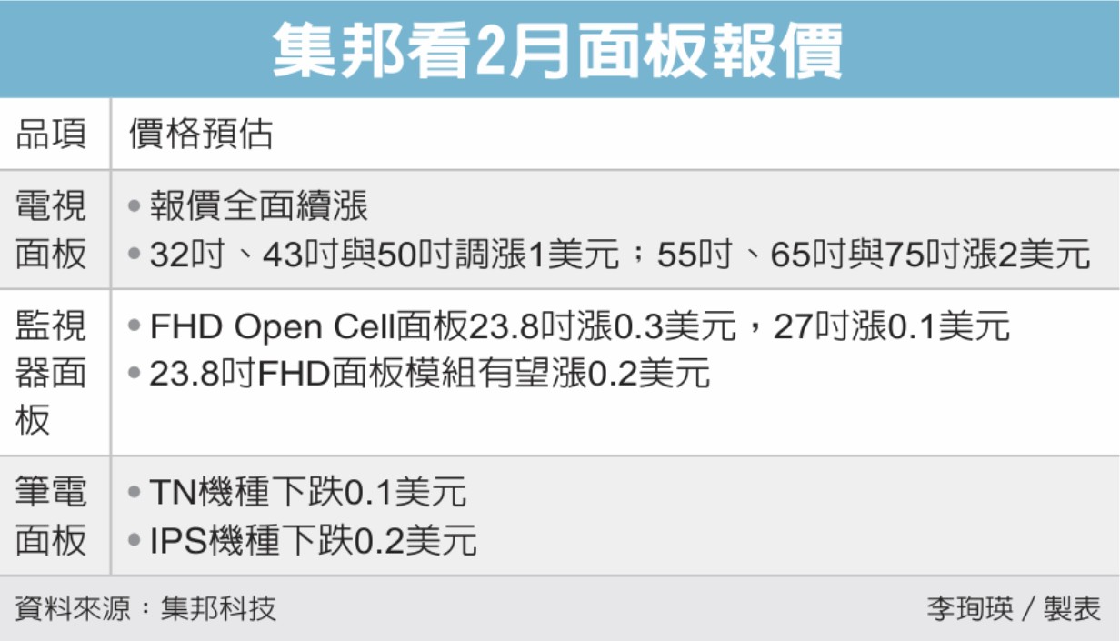 近日,研调机构集邦科技(TrendForce)在报告指出,随着主要面板厂持续调控产能,产能利用率下降使得供给持续紧缩,2月电视面板价格将全面走扬,显示器面板也因急单而有涨价可能。 法人看好,面板价格续扬,将助益友达、群创本季传统淡季运营。